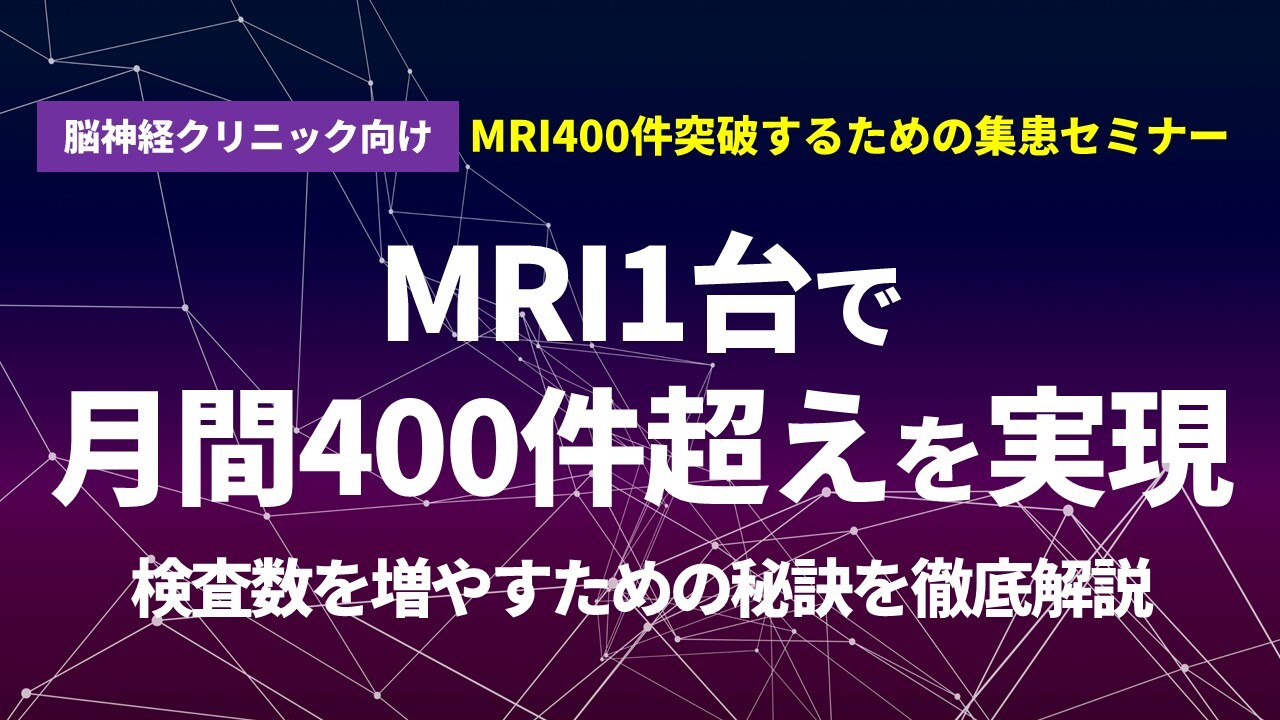 本セミナーは、脳神経外科クリニックがMRIの稼働率を向上させ、MRI1台で月間400件超えの撮影を実現するための、集患の秘訣を徹底解説します。